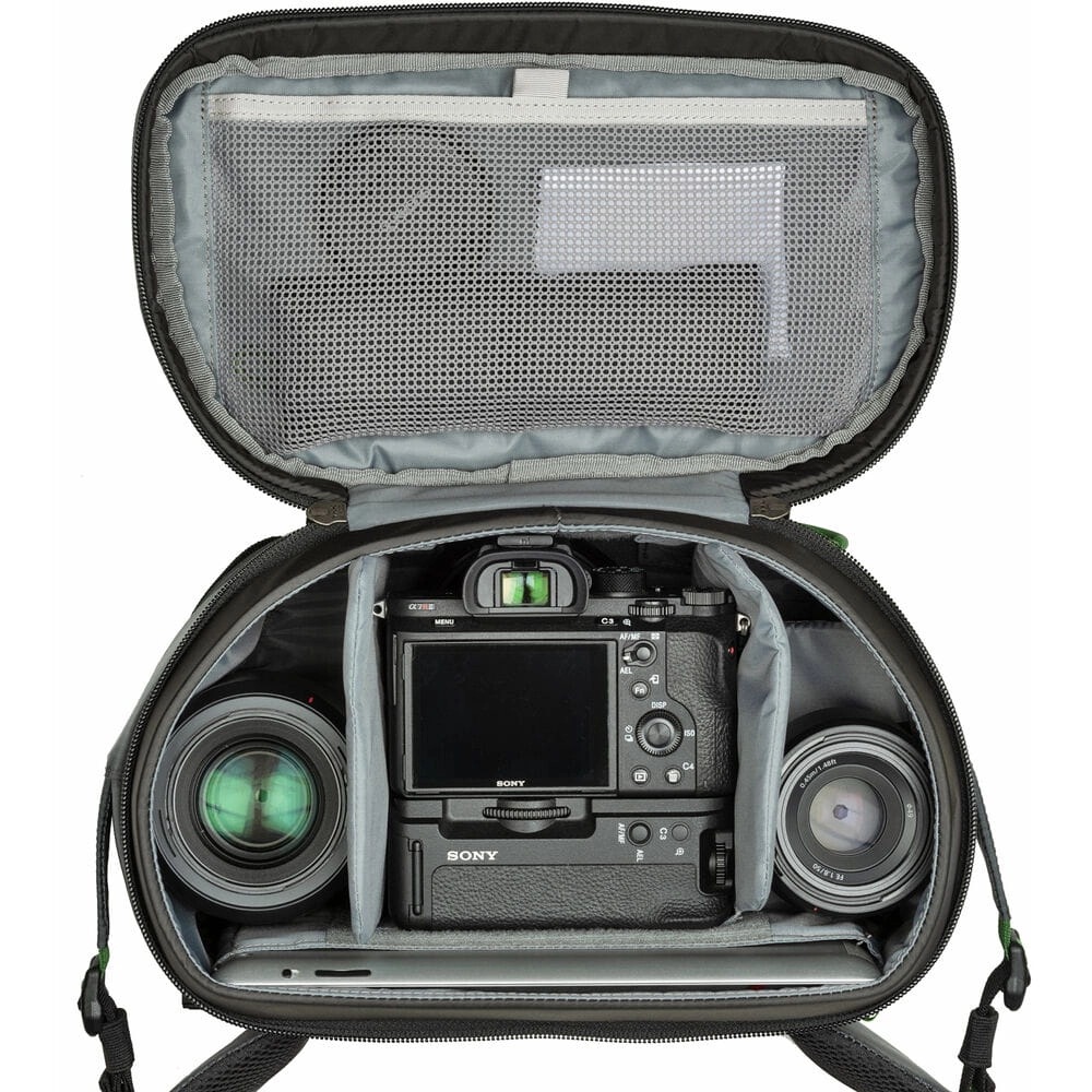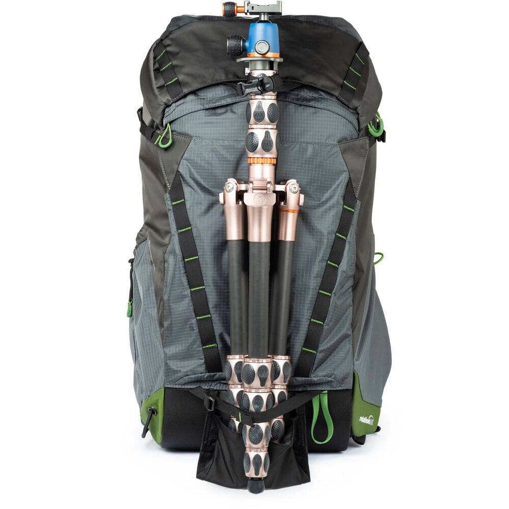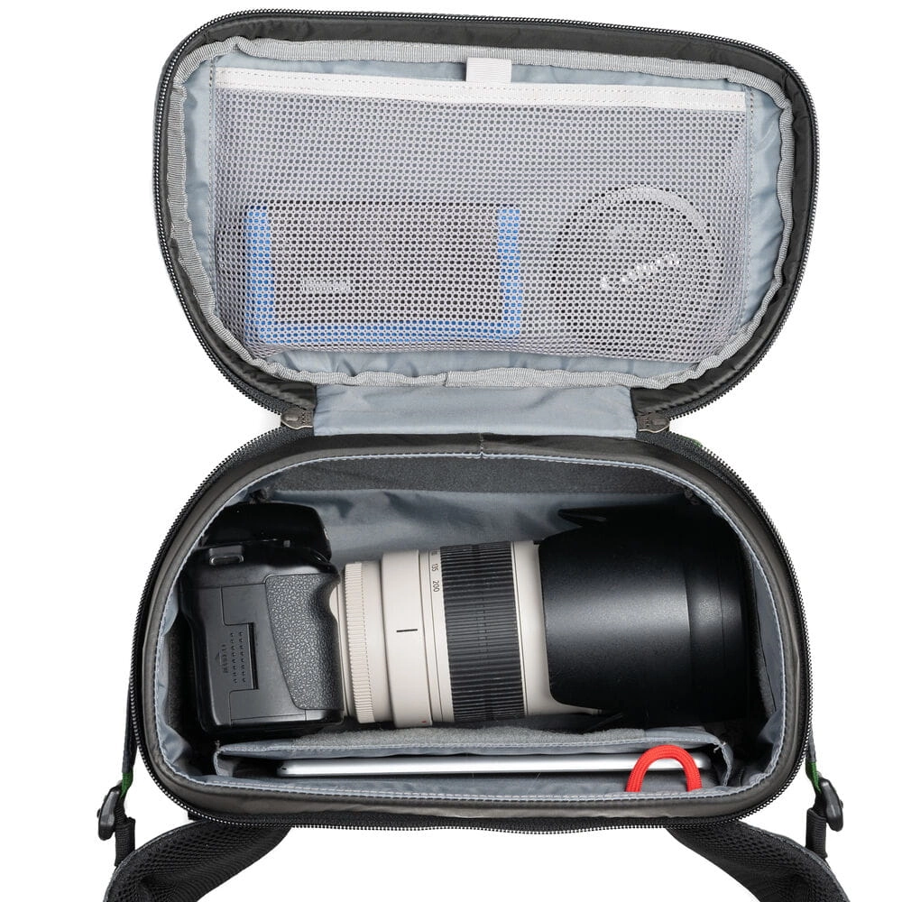 Górna komora o pojemności 25,5L przeznaczona jest na rzeczy osobiste, takie jak ubrania, jedzenie czy akcesoria. Dzięki licznym kieszeniom i uchwytom plecak zapewnia wygodną organizację przedmiotów, od kluczy po laptopa, statyw i wodę. Dziesięciopunktowy system uprzęży umożliwia równomierne rozłożenie ciężaru, co zapewnia komfort nawet podczas długich wędrówek.