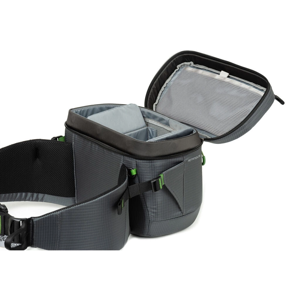 Na pierwszy rzut oka ThinkTank MindShift Rotation 180 34L może wyglądać jak standardowy plecak dwukomorowy, jednak jego innowacyjność tkwi w szczegółach. Dolna komora o pojemności 8,5L jest obrotowa, co pozwala na szybkie sięgnięcie po aparat i akcesoria bez zdejmowania plecaka. Ta część pomieści aparat DSLR lub bezlusterkowiec z 3–5 obiektywami albo z zamontowanym obiektywem 70-200 mm f/2.8, a także 10-calowy tablet.