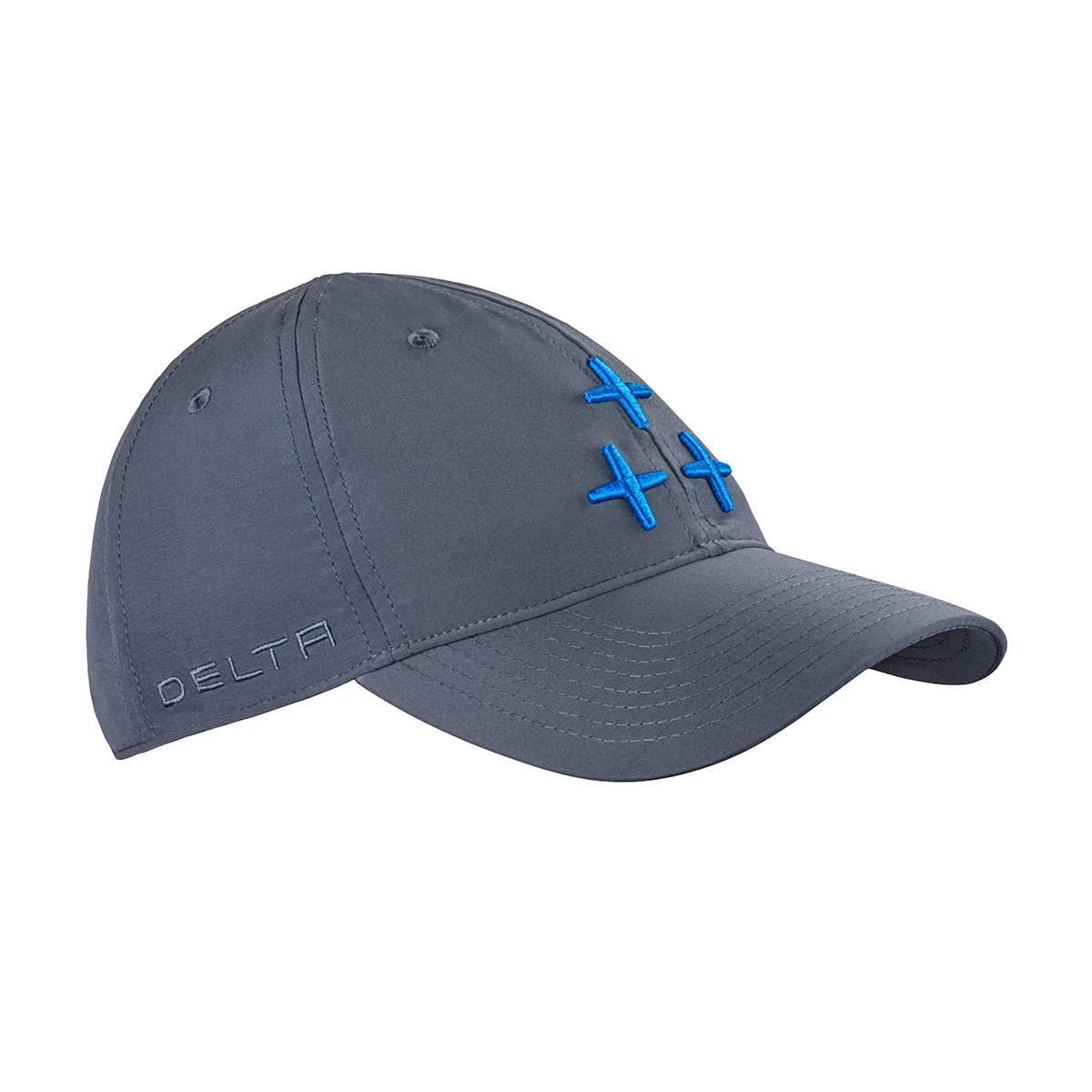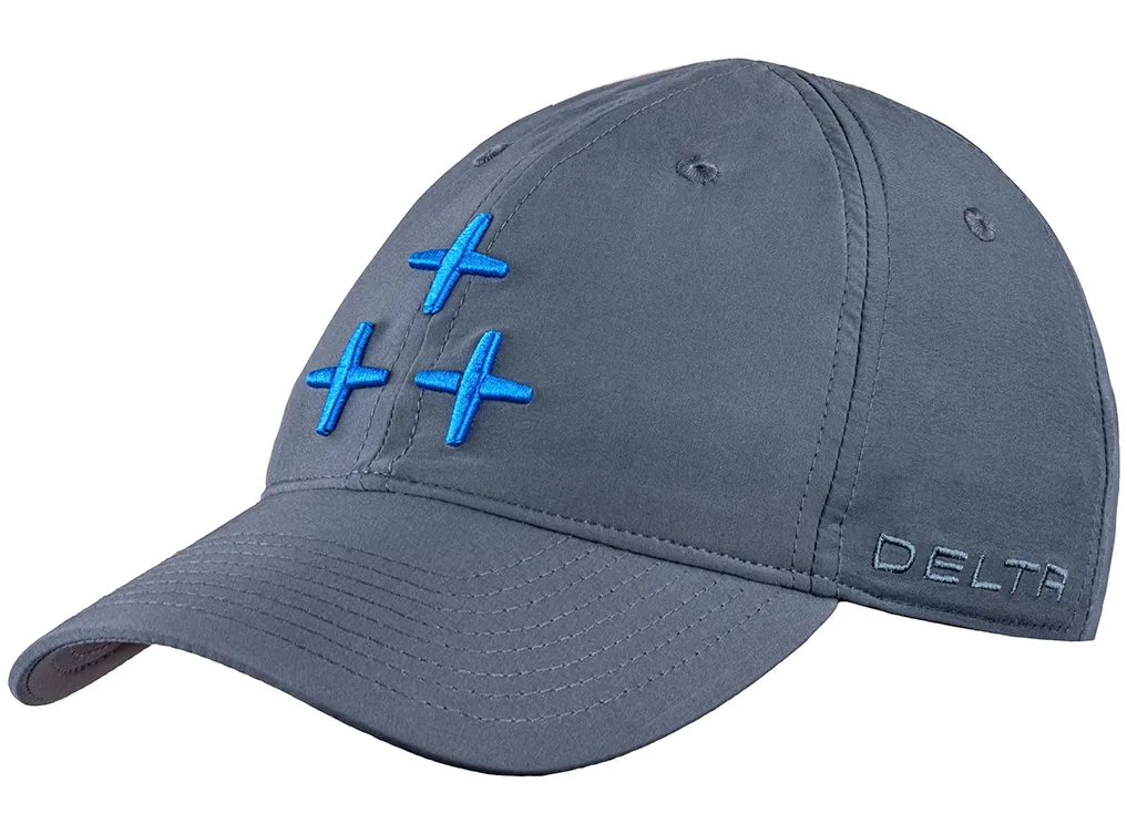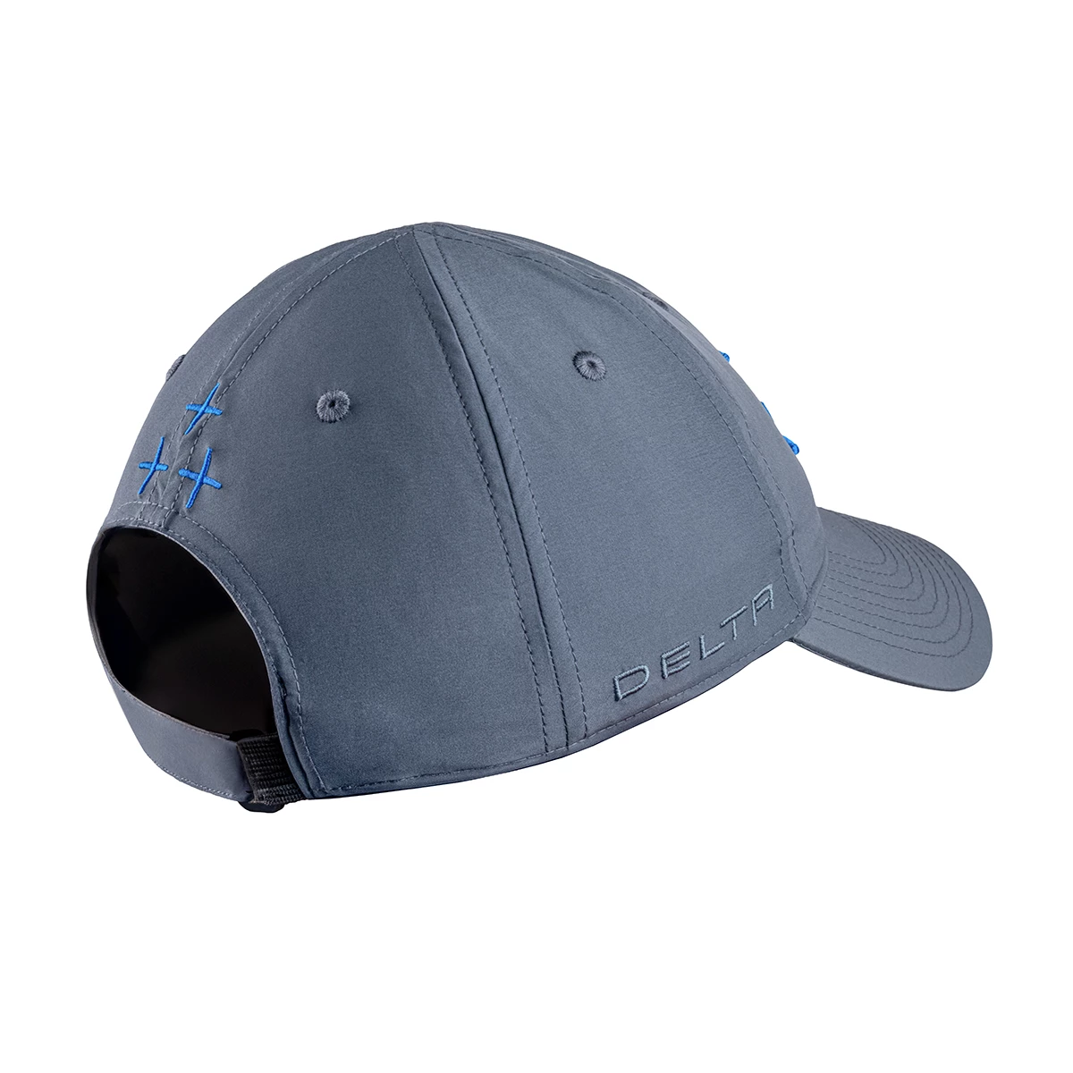 - Hafty z logo Delta z przodu, z boku i nad tylnym zapięciem