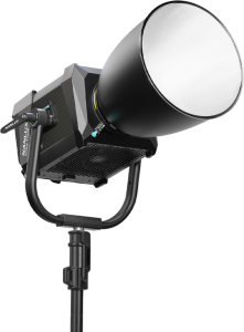 Magnezowa konstrukcja o szczelności IP55 chroni elektronikę przed pyłem i ulewami, a solidne jarzmo utrzymuje cięższe modyfikatory bez „opadania”. Inteligentne chłodzenie (tryby SMART/FULL/LOW/OFF) utrzymuje niski poziom hałasu – bezpiecznie dla setów dialogowych i nagrań ambientu. Waga głowicy ok. 15 kg daje stabilność na statywie, a długi przewód DC ułatwia ustawienie zasilacza poza kadrem. To zestaw, który sprawdza się w studiu, hali i w plenerze.