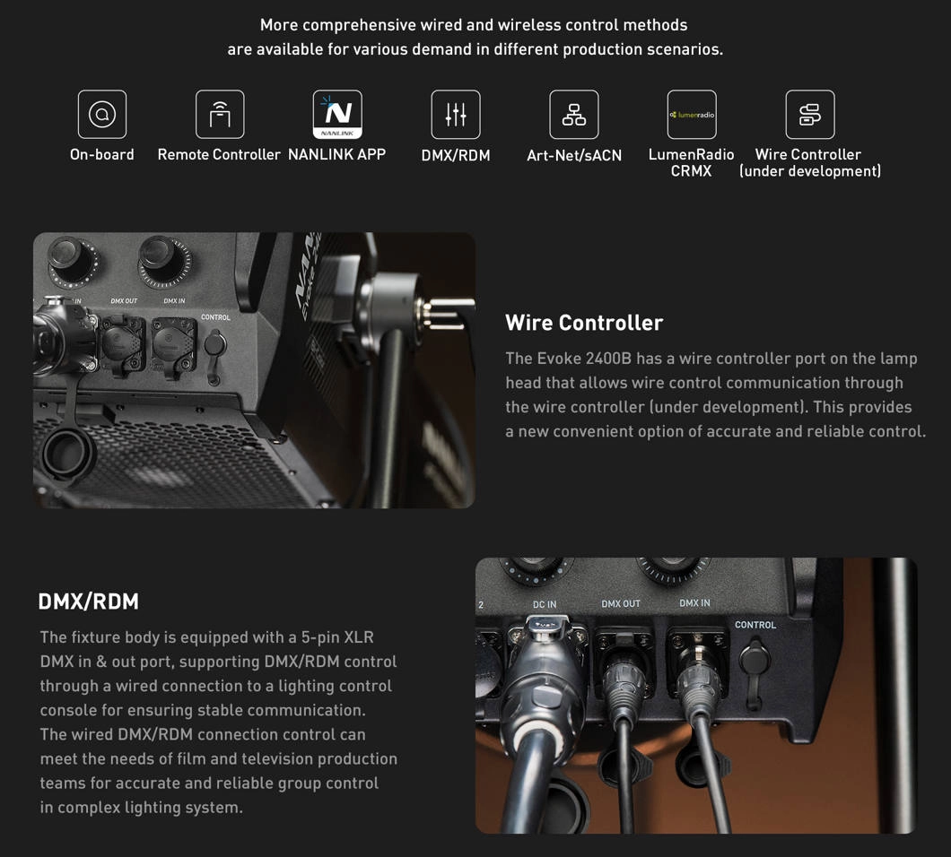 Masz pełną kontrolę zarówno lokalnie, jak i w sieci: panel na lampie, aplikacja NANLINK (Bluetooth / 2,4G), a także DMX/RDM oraz sieciowe Art-Net/sACN. Bezprzewodowe LumenRadio CRMX upraszcza montaż na scenie i w obiektach, gdzie nie chcesz kłaść kabli. Profile dimmingu, zapis/wywołanie presetów oraz aktualizacje przez USB i sieć skracają przygotowania między ujęciami. Evoke 2400B płynnie wchodzi w istniejący pipeline oświetleniowy – od małych setów po rozbudowane realizacje broadcastowe.