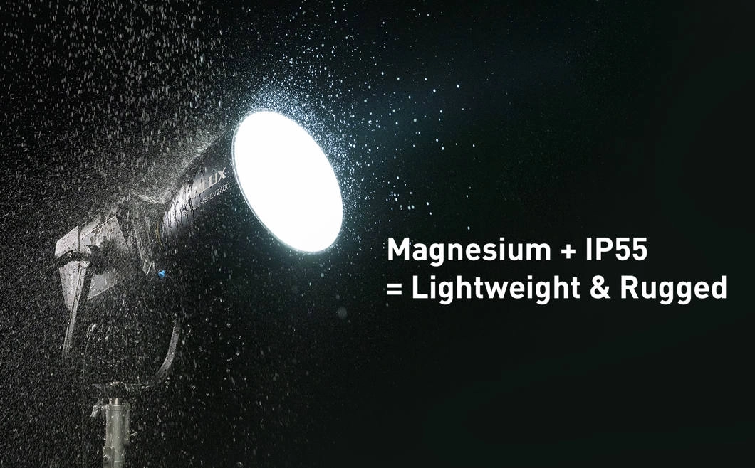 Magnezowa konstrukcja ze szczelnością IP55 chroni sprzęt przed kurzem i deszczem, a waga samej głowicy to ok. 15 kg – pewnie stoi na statywie i daje się wygodnie przenosić. Inteligentny system chłodzenia oferuje tryby SMART/FULL/LOW/OFF, a w trybie SMART poziom hałasu sięga jedynie 29 dBA. To bezpieczne warunki dla planów z dźwiękiem – nie musisz szukać kompromisu między mocą a ciszą.