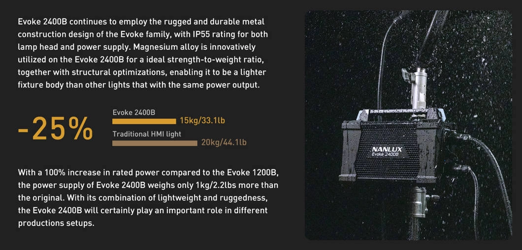 Lampa Nanlux Evoke 2400B + walizka transportowa + reflektor 45° to gotowy do wyjazdów zestaw z bi-kolorową jednostką 2400 W, która realnie zastępuje klasyczne źródła pokroju 4 kW HMI czy 10 kW wolframu – bez rozgrzewania i z pełnym ściemnianiem 0–100%.