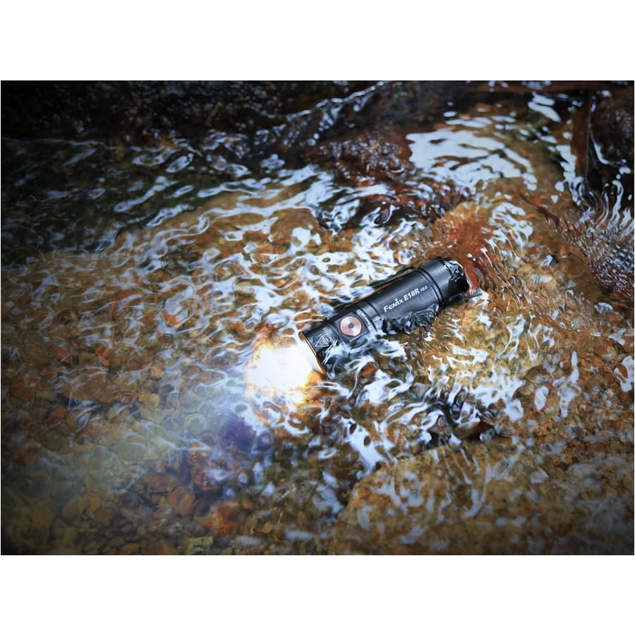 Źródłem światła jest mocna i jednocześnie energooszczędna dioda Luminus SST40, która emituje strumień świetlny aż 1200 lumenów. Pomimo kieszonkowego zasięgu latarki, zasięg odbicia świata wynosi blisko 146m, co pozwala jej widzieć dobrze widoczne obiekty. Nowa wersja E18R V2.0 wykorzystuje chłodną diodę LED, stopniowaną soczewkę kolimacyjną i odbłyśnik w postaci skórki pomarańczy. Taki układ optyczny sprawia, że strumień światła jest wydajny, dlatego Fenix E18R V2.0 doskonale sprawdził się jako latarka EDC, oświetlająca każdą formę aktywności na świeżym powietrzu.