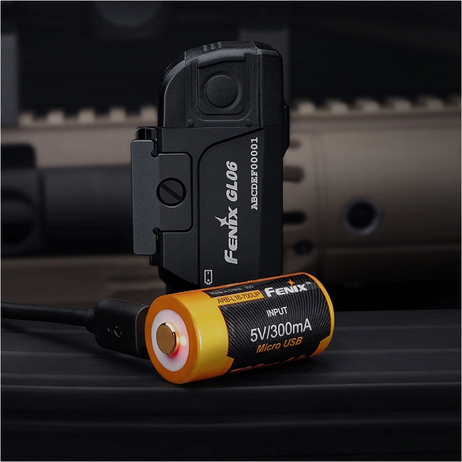 Źródłem energii dla Fenix GL06 jest akumulator ARB-L18-1100P z możliwością ładowania poprzez port micro USB. Wystarczy przewód i dowolne źródło zasilania, takie jak laptop, power bank czy ładowarka samochodowa. Pełne naładowanie trwa około 90 minut, co znacząco zwiększa wygodę użytkowania w terenie. Dodatkowo latarka może być zasilana baterią CR123, co daje alternatywę w sytuacjach awaryjnych. Wymiana ogniwa odbywa się od frontu urządzenia, bez potrzeby demontażu z broni.