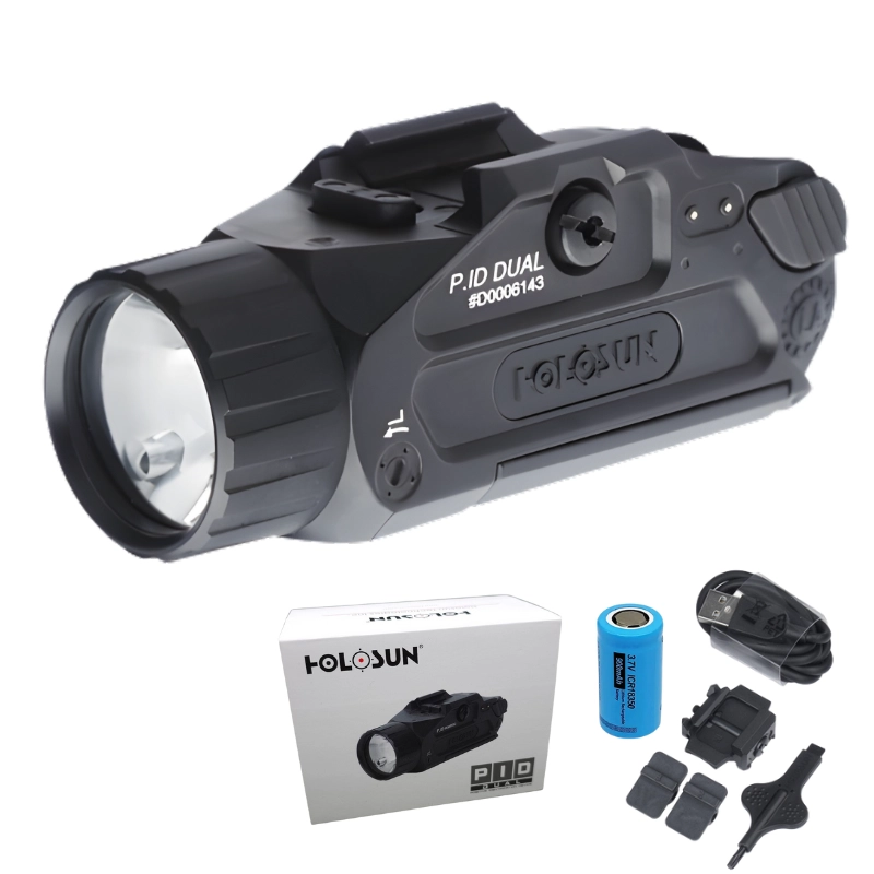 Holosun P.ID Dual to kompaktowa latarka taktyczna na broń łącząca mocne światło (High 800 lm / 17 000 cd) z dwoma wskaźnikami: zielonym laserem do pracy dziennej i IR laserem pod noktowizję. Montujesz ją na szynie Picatinny, ładujesz magnetycznym kablem USB z boku i obsługujesz oburęcznie wydłużonymi Paddle Switchami. Korpus z aluminium 7075-T6 i szczelność IP68 zapewniają gotowość do działania w każdych warunkach.