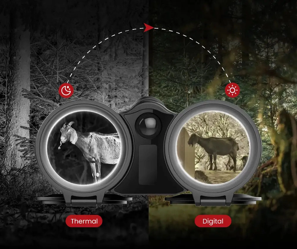 Korzystając z Guide DN70M 2.0 zyskujesz jednocześnie lornetkę cyfrową i termowizor obserwacyjny. Moduł termiczny z obiektywem 25 mm F1.0 odpowiada za szybkie wykrycie źródeł ciepła – ludzi, zwierzyny czy pojazdów – nawet na dystansie do 1300 m. Moduł dzienny z obiektywem 70 mm F1.8 i matrycą 4K umożliwia z kolei bardzo szczegółową identyfikację tego, co wcześniej wykryłeś w termowizji. Przełączając tryby, nie zmieniasz sprzętu ani pozycji – robisz to płynnie z poziomu urządzenia, nie tracąc celu z pola widzenia. Takie połączenie jest szczególnie wygodne, gdy działasz w zmiennym świetle, np. o świcie lub o zmierzchu.
