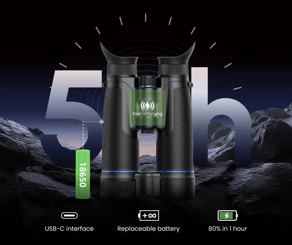 Z Guide DN70M 2.0 nie przerywasz obserwacji w najmniej odpowiednim momencie, bo urządzenie korzysta z podwójnego systemu zasilania. Do dyspozycji masz wbudowany akumulator, który obsługuje szybkie ładowanie 18 W, oraz wymienną baterię 18650. Gdy poziom energii spada, po prostu podmieniasz ogniwo, korzystając z funkcji hot swap – lornetka pozostaje włączona, a Ty nie tracisz celu z oka. Łączny czas pracy wynosi około 5 godzin, co w wielu zastosowaniach wystarczy na całe wyjście w teren.