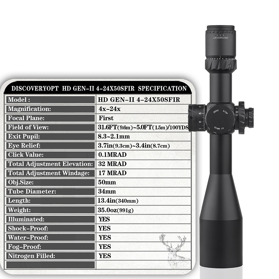 Specyfikacja techniczna Luneta celownicza Discovery Optics HD GEN2 4-24x50 SFIR FFP MRAD-Z 34 mm