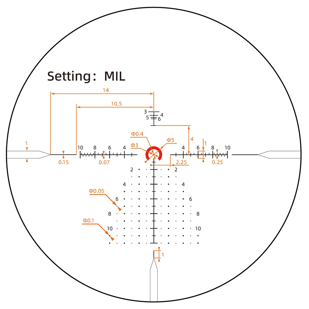 Luneta posiada podświetlaną siatkę celowniczą typu VCO-2 MIL umieszczoną w pierwszym planie (FFP). Skala siatki MIL ułatwia wprowadzanie poprawek podczas strzelania na różne dystanse. Po zwiększeniu powiększenia siatka powiększa się razem z obrazem, co ułatwia precyzyjne celowanie. Podświetlenie ma 11 poziomów regulacji, co pozwala dopasować je do warunków oświetleniowych. To rozwiązanie jest przydatne zarówno w dzień, jak i w nocy.