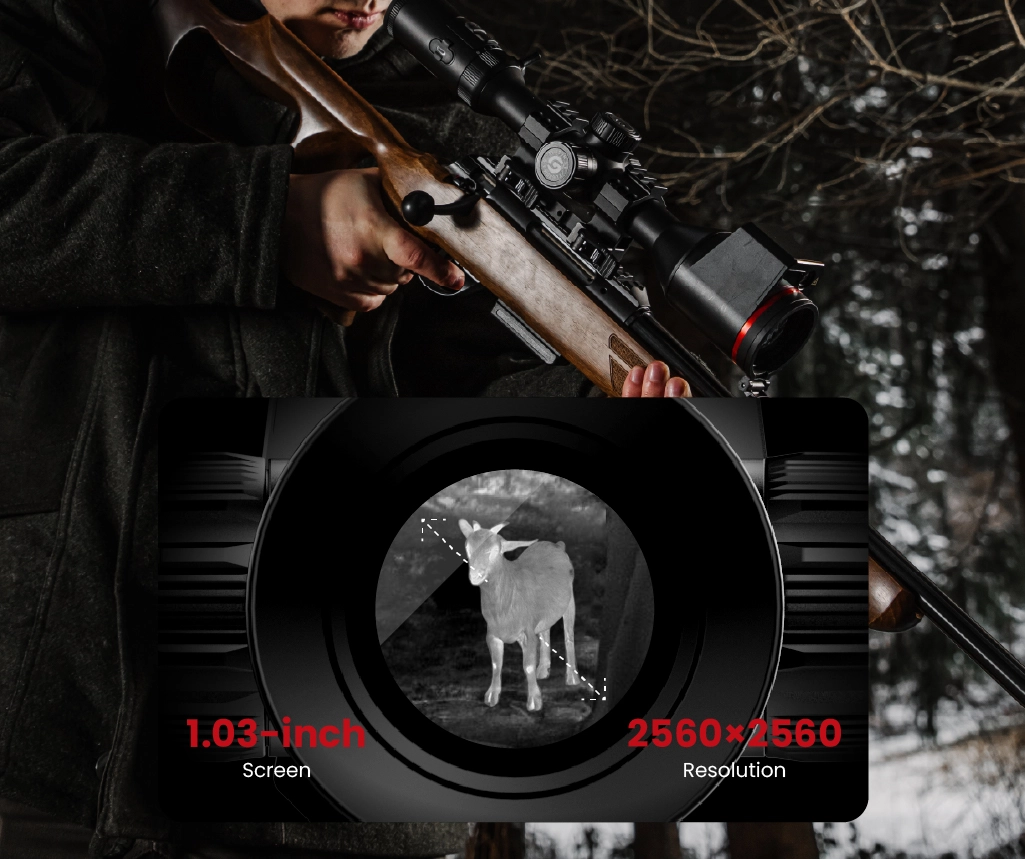 Seria TU Muo 3.0, w tym Guide TU650M 3.0, korzysta z dużego wyświetlacza AMOLED 1,03" o rozdzielczości 2560×2560 px. Taka matryca daje bardzo szczegółowy, „gładki” obraz bez widocznych pikseli, co znacząco ułatwia ocenę sylwetki zwierzyny i tła. Odległość źrenicy ok. 60 mm pozwala wygodnie złożyć się do strzału również na broni o mocniejszym odrzucie, a szerokie pole widzenia pomaga kontrolować szerszy wycinek łowiska.