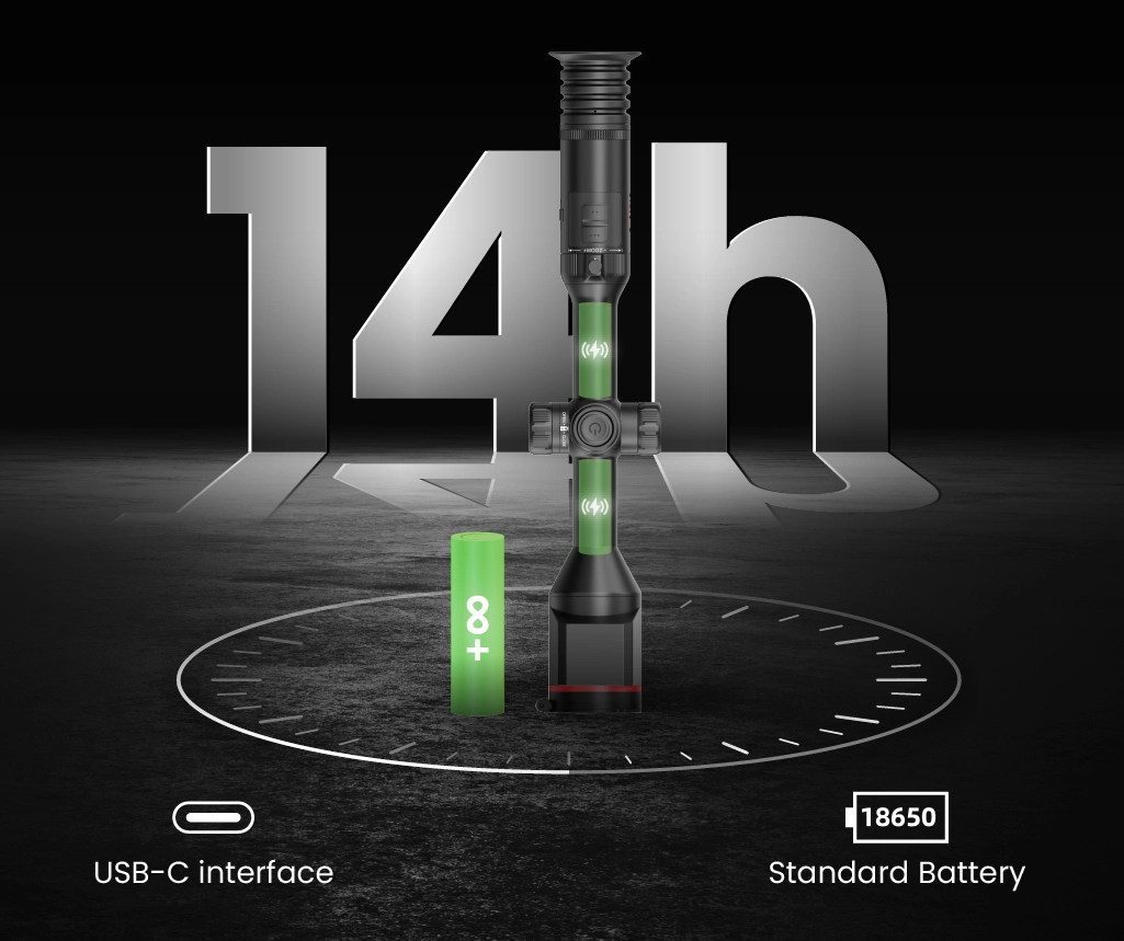 Za zasilanie lunety termowizyjnej/cyfrowej Guide TU650M 3.0 odpowiada podwójny system baterii: dwa wbudowane akumulatory 18650 oraz zewnętrzny moduł na dodatkowe ogniwo. Taki układ zapewnia do ok. 14 godzin pracy na jednym zestawie, a funkcja „hot swap” pozwala wymieniać akumulator bez wyłączania urządzenia. W praktyce możesz zaplanować całą noc w łowisku bez stresu o stan baterii – a gdy to potrzebne, podłączasz dodatkowo powerbank przez USB-C i jeszcze bardziej wydłużasz czas działania. :contentReference[oaicite:12]{index=12}