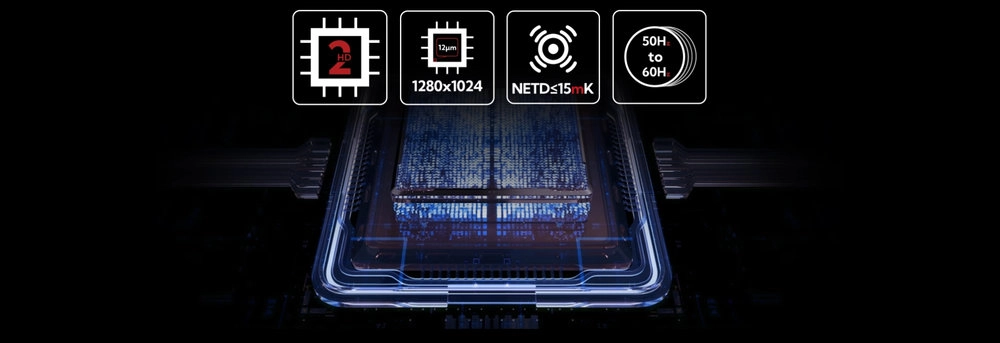 - 1280×1024 / 12 µm, NETD ≤15 mK, 50 Hz – płynny, szczegółowy obraz przy niskim kontraście sceny.