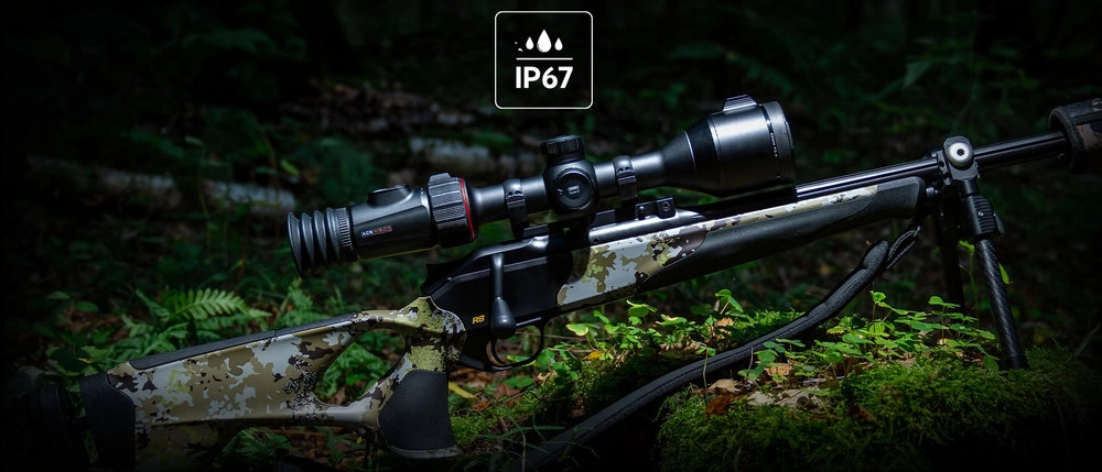 Aluminiowy korpus o wysokiej wytrzymałości i uszczelnienia klasy terenowej przygotowują lunetę Nocpix Ace S60R na deszcz, kurz i odrzut.