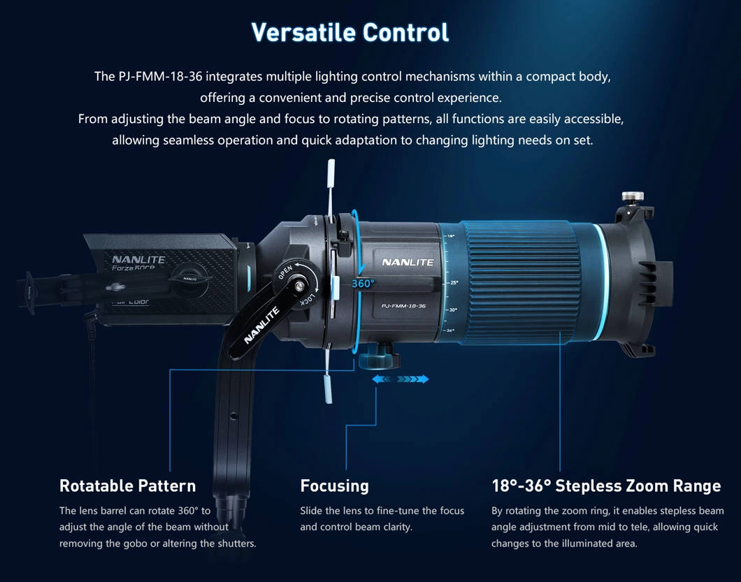 Nanlite FM Mount Projection Attachment 18°–36° to narzędzie stworzone z myślą o profesjonalistach, którzy oczekują pełnej kontroli nad światłem. Dzięki niemu kompatybilne lampy z mocowaniem FM zmieniają się w potężne reflektory projekcyjne, pozwalające kształtować, skupiać i kierować wiązkę światła dokładnie tam, gdzie jest potrzebna.