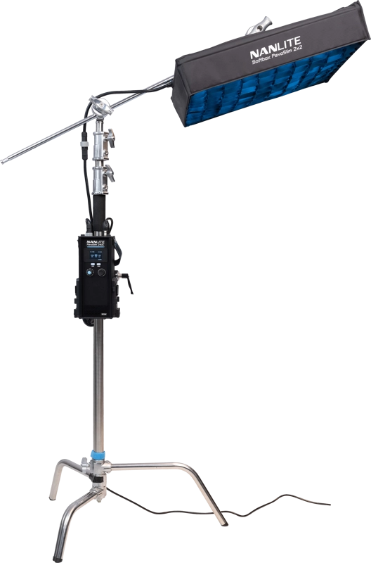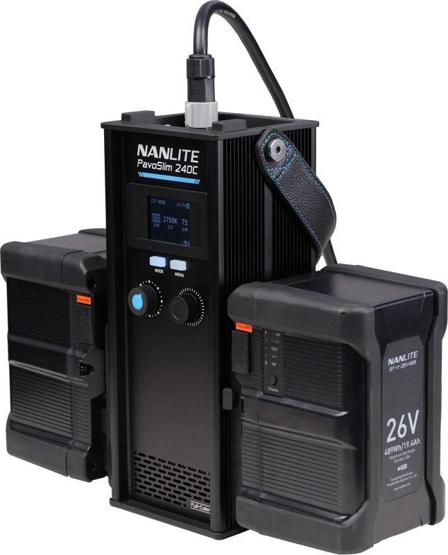 PavoSlim 240C może pracować na zasilaniu AC, DC oraz z akumulatorami V-Mount (14,4 V, 26 V). Obsługuje pełną moc wyjściową przy pracy na dwóch bateriach V-Mount i umożliwia wymianę źródła zasilania podczas pracy. To elastyczne rozwiązanie, które gwarantuje ciągłość oświetlenia w każdych warunkach.