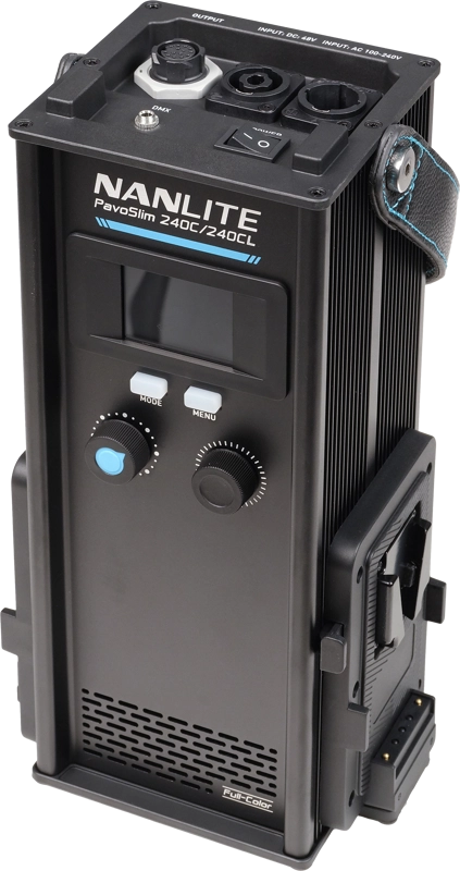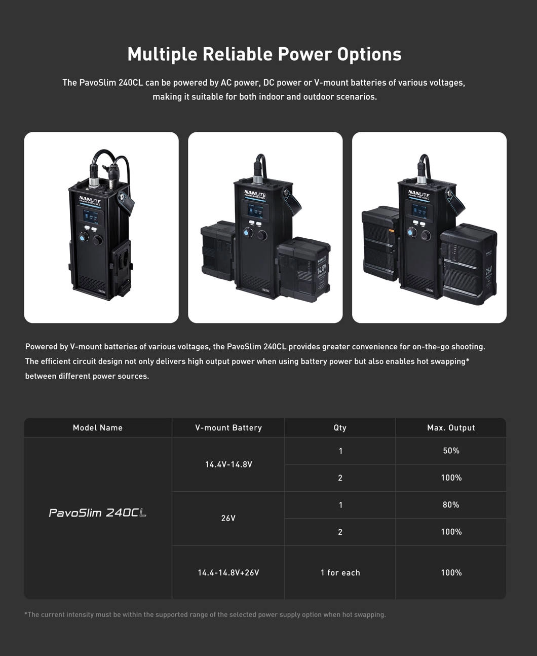 Lampa może pracować na zasilaniu AC, DC lub przy użyciu baterii V-Mount, co daje pełną swobodę podczas realizacji zdjęć w plenerze. Obsługa hot-swap pozwala wymieniać źródła zasilania w trakcie pracy bez przerywania nagrania. To sprawia, że PavoSlim 240CL jest gotowy do działania w każdych warunkach.