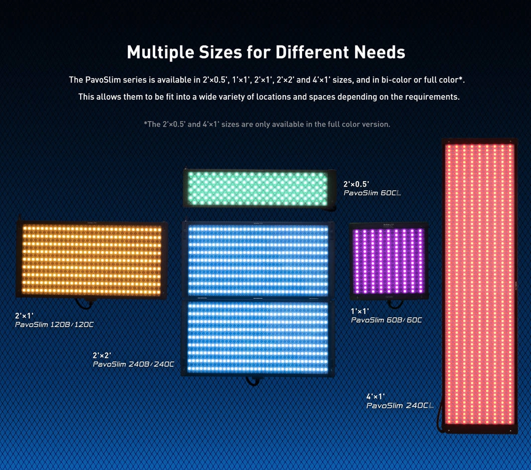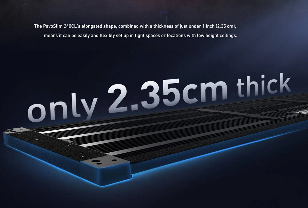 Panele PavoSlim słyną ze swojej ultracienkiej budowy – 240CL ma grubość zaledwie 2,35 cm. Wymiary 4' x 1' (120 × 30 cm) sprawiają, że łatwo mieści się w ograniczonych przestrzeniach, np. niskich sufitach czy scenografiach. Długi bok daje efekt miękkiego światła, a krótszy – mocniejszego, co zwiększa elastyczność zastosowania.