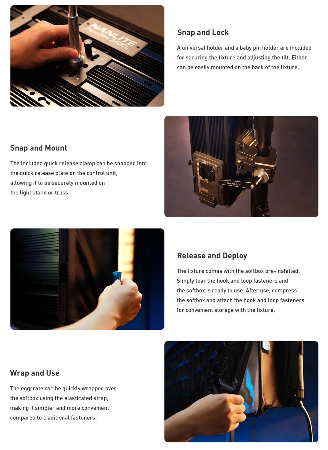 System Snap & Lock ułatwia szybki montaż panelu, a dołączony softbox i eggcrate pozwalają precyzyjnie kształtować światło. Dzięki lekkiej, aluminiowej konstrukcji i wydajnemu systemowi chłodzenia panel pozostaje niezawodny nawet podczas długiej pracy.
