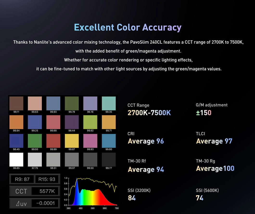 Lampa obsługuje temperaturę barwową w zakresie 2700K–7500K oraz regulację zieleni/magenty w zakresie ±150. Wysokie współczynniki CRI 96 i TLCI 97 gwarantują naturalne odwzorowanie kolorów, co jest kluczowe w profesjonalnych zdjęciach i filmie. Dzięki temu PavoSlim 240CL świetnie sprawdza się zarówno jako światło główne, jak i w konfiguracjach uzupełniających.