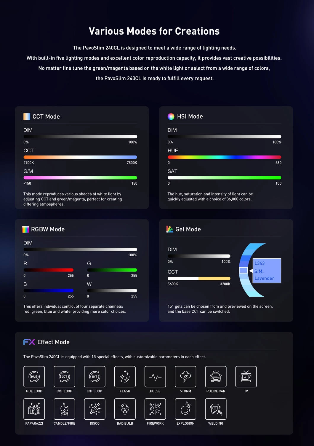 Panel oferuje pięć trybów pracy: CCT, HSI, RGBW, GEL oraz EFFECT. Do dyspozycji użytkownika jest także 15 efektów specjalnych, takich jak Storm, Firework, TV, Candle czy Police Car. To rozwiązanie daje pełną swobodę twórczą i pozwala na szybkie tworzenie realistycznych scenariuszy świetlnych na planie.