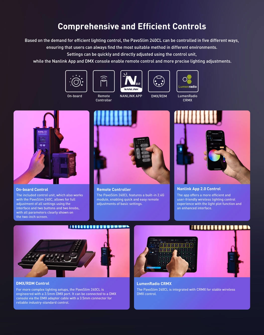 PavoSlim 240CL daje pełną kontrolę dzięki wbudowanym panelom, aplikacji Nanlink, sterowaniu DMX/RDM oraz bezprzewodowemu LumenRadio CRMX. To sprawia, że panel doskonale integruje się z profesjonalnymi workflow, niezależnie od tego, czy pracujesz w studiu, czy w produkcjach terenowych.