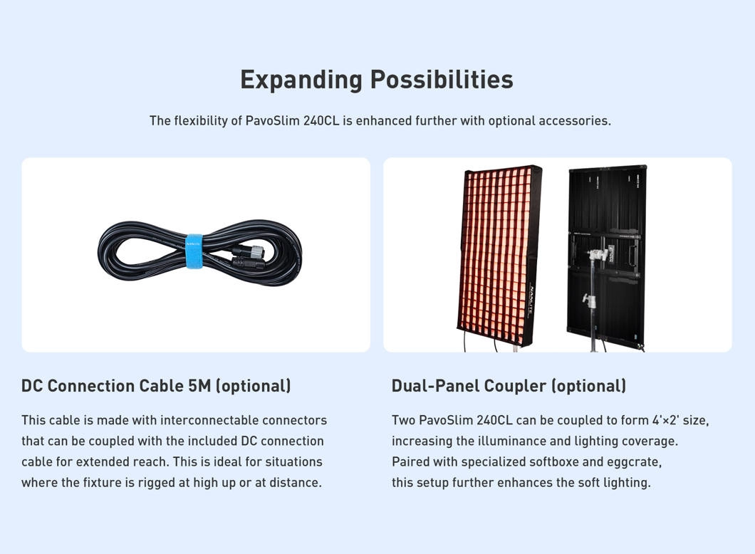 Dzięki opcjonalnym akcesoriom, takim jak łącznik dwóch paneli 4' × 2' czy przedłużacz DC o długości 5 m, lampa oferuje jeszcze większe możliwości konfiguracyjne. To rozwiązanie, które sprawia, że PavoSlim 240CL wyróżnia się elastycznością i może być dopasowany do każdego projektu.