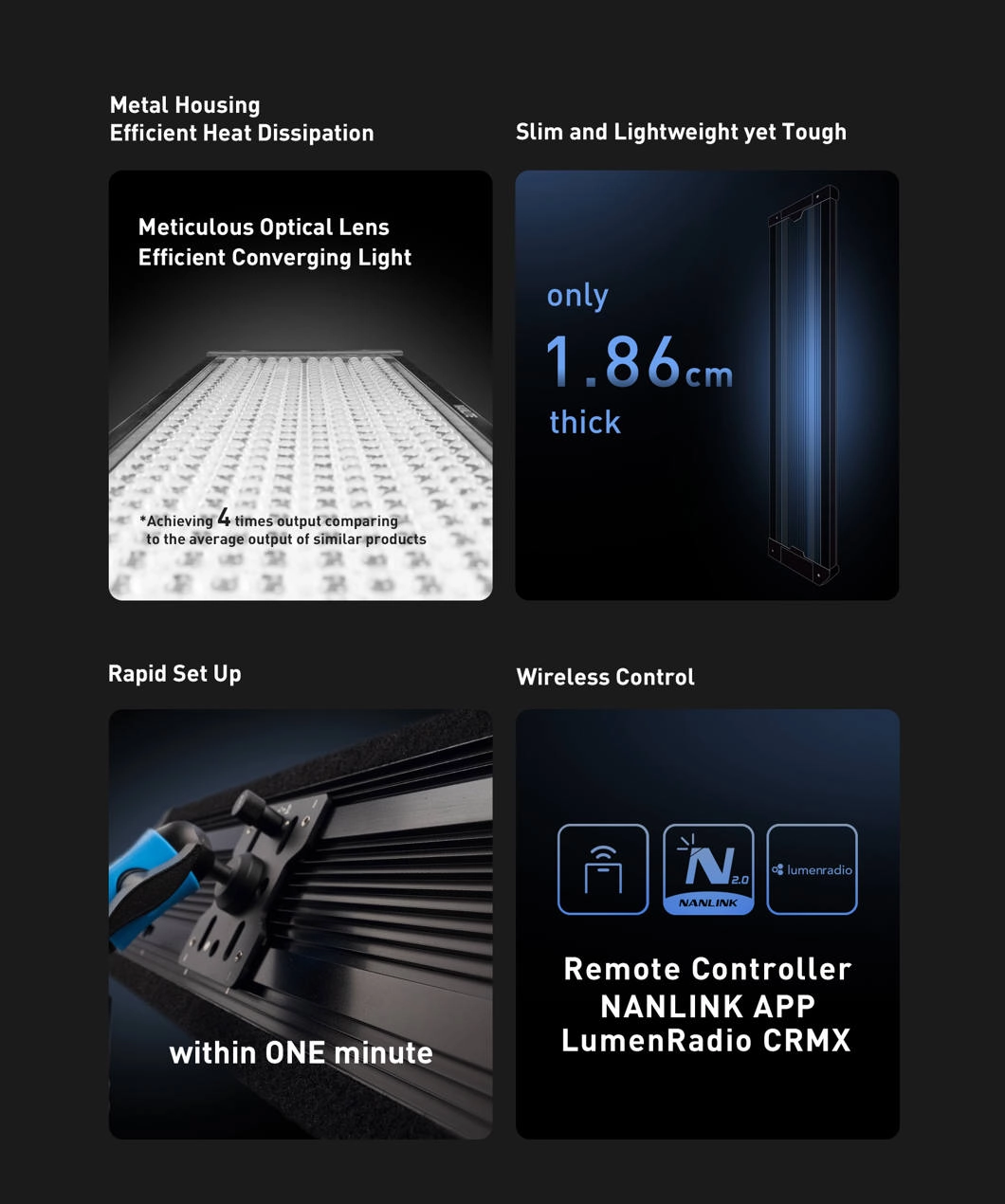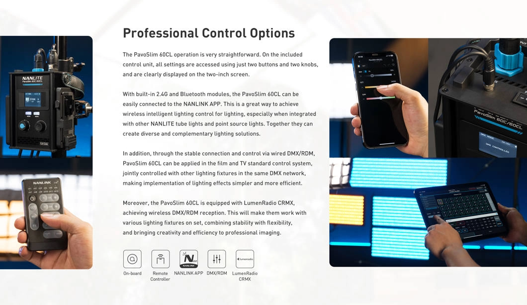 Urządzenie obsługuje sterowanie przewodowe i bezprzewodowe. Na jednostce sterującej dostępne są dwa przyciski, dwa pokrętła i ekran 2". Wbudowane moduły Bluetooth i 2.4G umożliwiają obsługę przez aplikację NANLINK, a LumenRadio CRMX zapewnia stabilny bezprzewodowy DMX/RDM. Dzięki temu panel łatwo zintegrować z innymi oprawami oświetleniowymi.