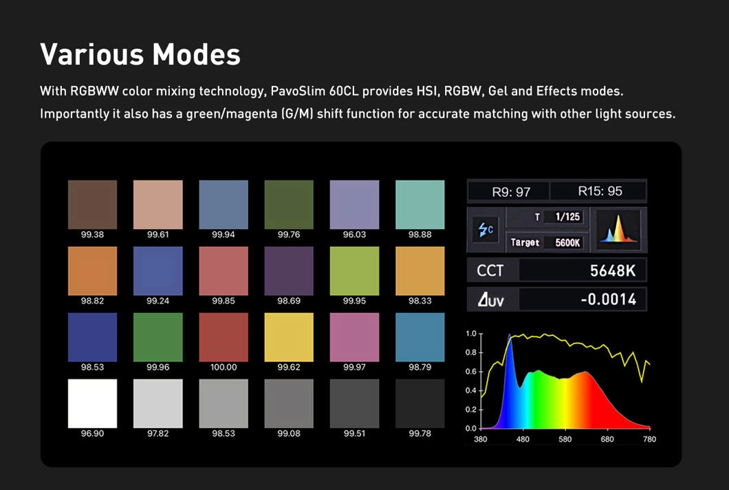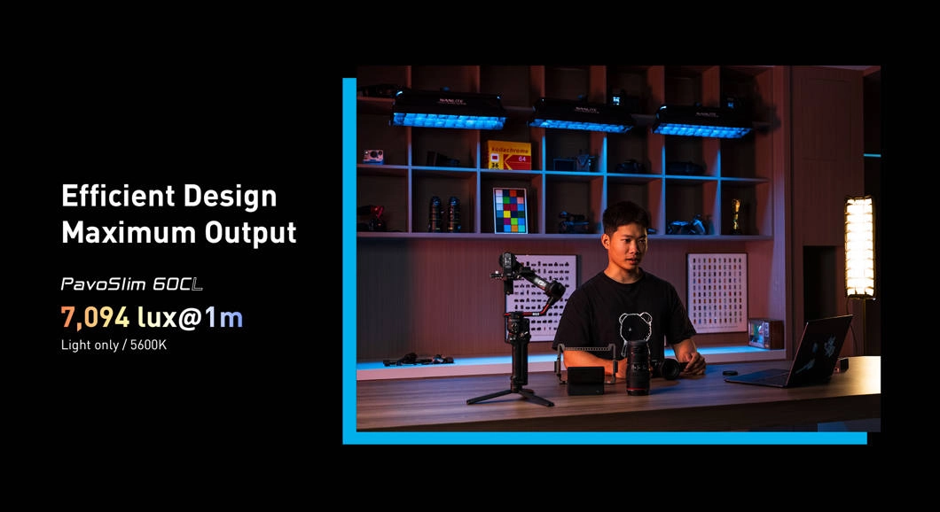 Zespół Nanlite opracował dedykowany system optyczny, który maksymalizuje moc i rozpraszanie ciepła. W efekcie PavoSlim 60CL osiąga 7094 lux przy 1 m i 5600K – czterokrotnie więcej niż porównywalne panele LED typu mata.