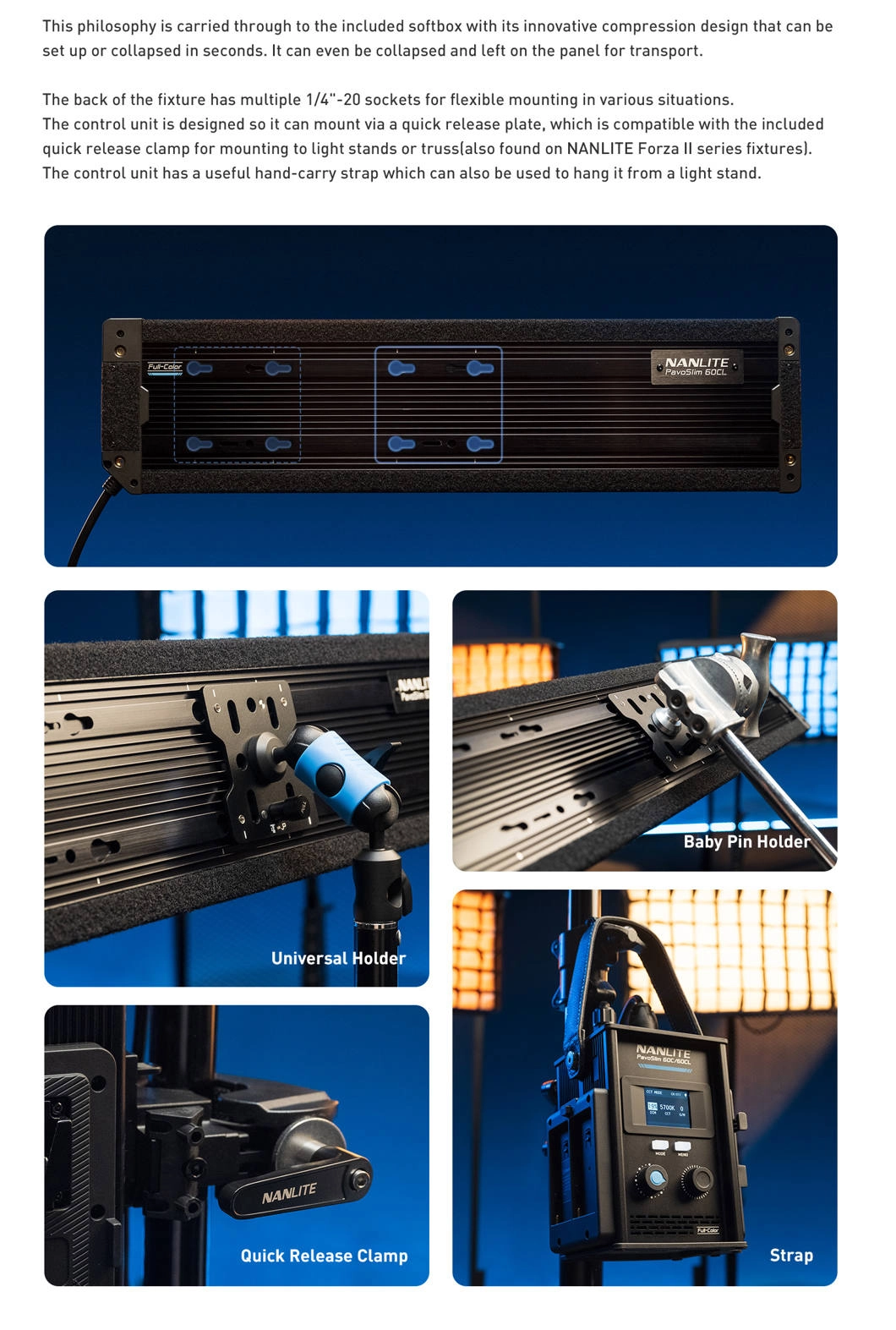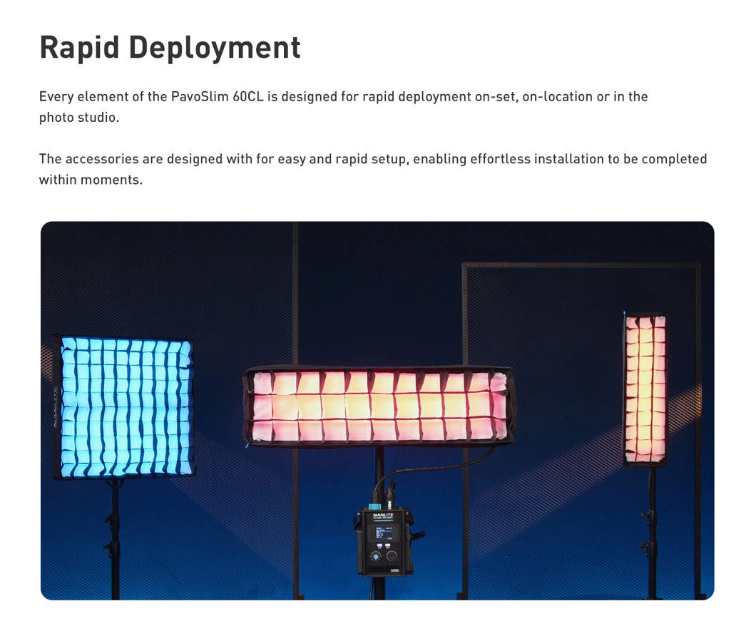PavoSlim 60CL można przygotować do pracy w kilka chwil. Dołączony softbox ma innowacyjną konstrukcję kompresyjną, którą łatwo złożyć i rozłożyć. Panel wyposażono w liczne gniazda 1/4"-20, a jednostka sterująca z płytką szybkiego zwalniania pasuje do statywów i kratownic. Pasek przenośny dodatkowo zwiększa mobilność.