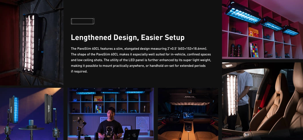 PavoSlim 60CL to panel LED nowej generacji, zaprojektowany specjalnie do pracy w ciasnych przestrzeniach. Wydłużona, kompaktowa konstrukcja łączy lekkość, szybki montaż, wysoką luminancję i wierne odwzorowanie kolorów. Dzięki temu twórcy zyskują narzędzie o ogromnej elastyczności, które sprawdzi się zarówno w studiu, jak i w terenie.