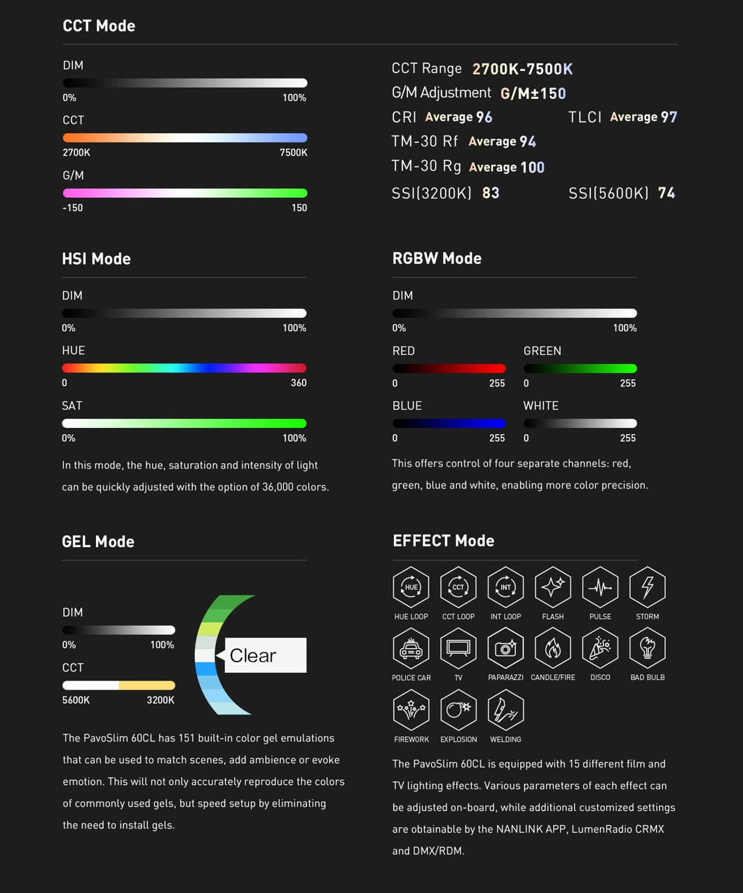 CCT (2700K–7500K, G/M ±150, CRI 96, TLCI 97),