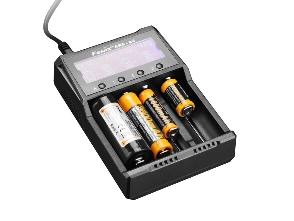 Fenix ARE-A4 to inteligentna ładowarka nowej generacji, dzieki, której prawidłowo i bezpiecznie naładujemy różnego rodzaju akumulatory Li-ion, Ni-MH oraz Ni-Cd. Pomimo zaawansowanej konstrukcji, obsługa urządzenia jest niezwykle prosta. Po włożeniu akumulatorów i podłączeniu ładowarki do prądu, na wyświetlaczu LCD pojawią się informacje o poziomie napięciu oraz graficzna wizualizacja poziomu ich naładowania.
