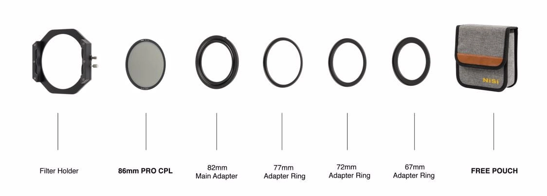 Ten zestaw jest dostarczany z ultra cienkim filtrem polaryzacyjnym 86 mm (CPL) i 4 pierścieniami przejściowymi dla najpopularniejszych średnic filtra (67 mm, 72 mm, 77 mm i 82 mm). W zestawie znajduje się praktyczna półmiękka torba do przechowywania.