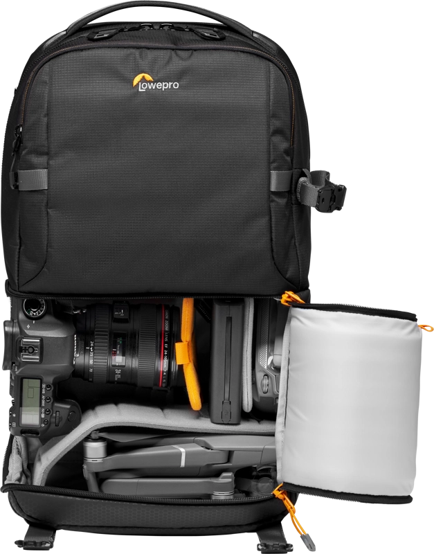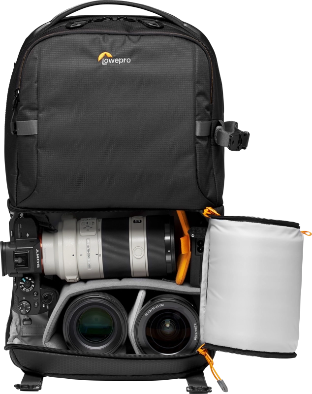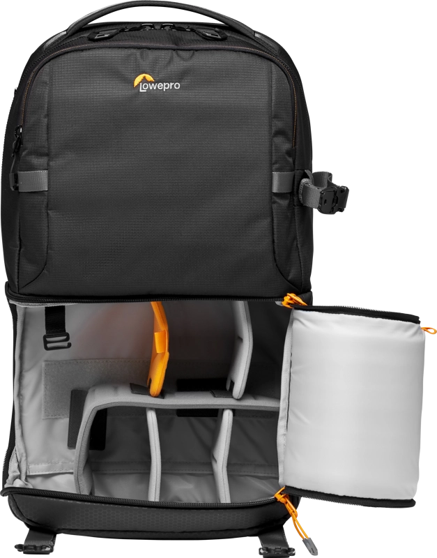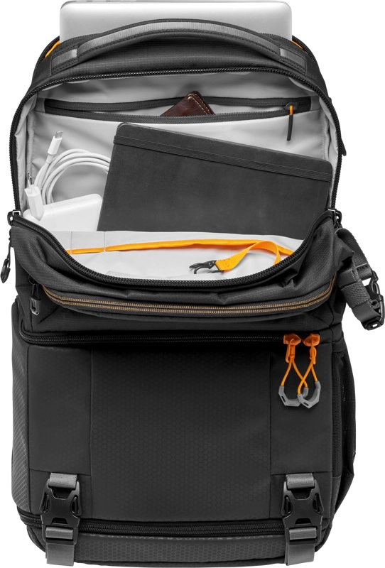 Czarny plecak fotograficzny Lowepro Fastpack BP 250 AW III to wszechstronny plecak, który ma dwie główne przegrody, w tym przegrodę na aparat wzdłuż podstawy torby, która może być używana do przechowywania małej lustrzanki cyfrowej lub aparatu bezlusterkowego z trzema lub czterema obiektywami, w tym dołączony obiektyw 24-70mm f/2.8. Umieszczony w taki sposób, że można do niego dotrzeć, gdy torba jest obracana z tyłu do przodu, lewą stroną skierowaną do góry, zapinany na zamek błyskawiczny otwór komory aparatu zawiera wewnętrzny system klipsów, który pozwala użytkownikowi zapewnić, że otwór zapinany na zamek zapewnia bok tylko dostęp. Alternatywnie, system zaciskowy może zostać zwolniony tak, że odrywany otwór może być całkowicie odpięty i schowany, umożliwiając pełny dostęp do komory aparatu, na przykład gdy torba jest umieszczona na płaskiej powierzchni z paskami plecaka skierowanymi w dół. Nad komorą aparatu znajduje się górna komora do przechowywania zapinana na zamek błyskawiczny, która pomieści odzież do spakowania i posiada kieszenie z organizerem, w których można przechowywać dokumenty podróżne, baterie do aparatu, karty pamięci lub małą elektronikę.