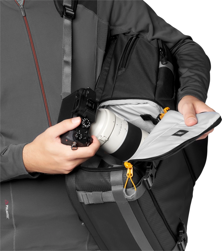 - Szybki i łatwy dostęp QuickDoor - umożliwia dwa tryby dostępu: szybki dostęp z boku i pełny dostęp do głównej komory aparatu w celu konfiguracji lub pracy z torby.
