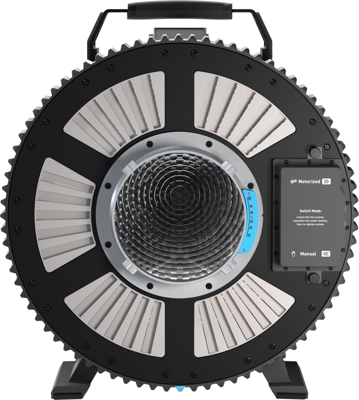 Silnik Fresnela jest zasilany przez styki elektroniczne w mocowaniu NL Evoke 2400B, więc nie musisz podłączać dodatkowych zasilaczy. Reguluj ogniskowanie wiązki na kilka sposobów: aplikacją NANLINK, z poziomu menu lampy, przez DMX, przewodowy kontroler lub fizycznym przyciskiem na samym obiektywie. Dzięki temu dopasowujesz workflow do planu – w studiu podłączasz konsolę, w lokacji korzystasz z telefonu, a przy szybkiej pracy na planie filmowym wystarczy jeden klik bezpośrednio na Fresnelu. Jeśli wolisz mechanikę – odłącz napęd i ustaw kąt ręcznie, zachowując pełną powtarzalność.