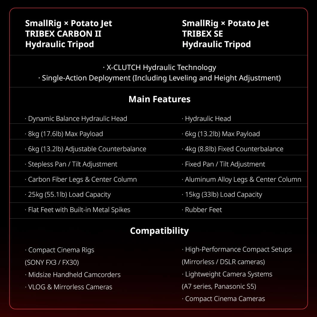 - Model: Smallrig 5755 X Potato Jet TRIBEX Carbon II Tripod Kit