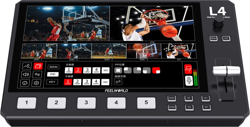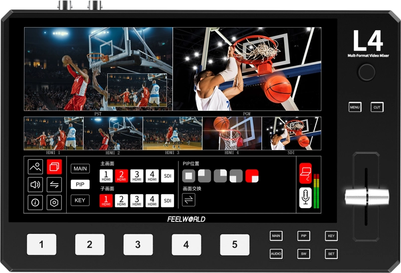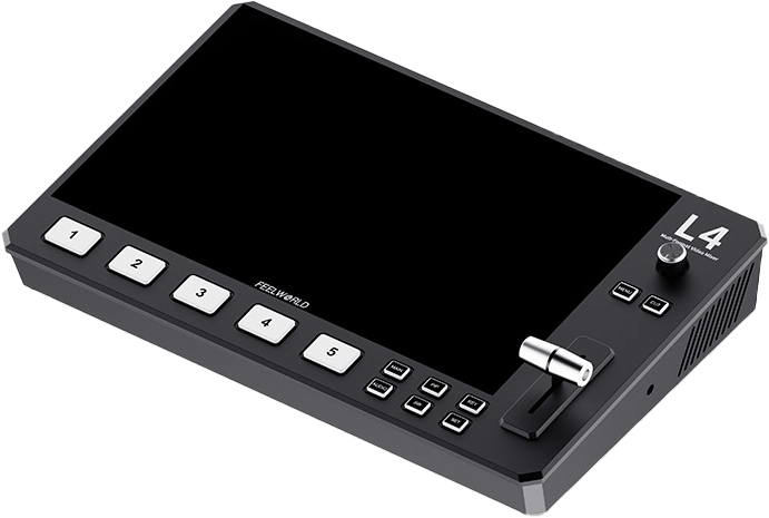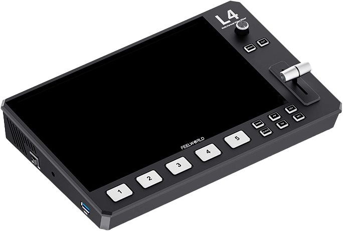Przełączaj, kontroluj i transmituj obraz wideo na żywo z jednego wejścia SDI oraz czterech wejść HDMI dzięki przełącznikowi FeelWorld L4 HDMI Livestream Switcher z wbudowanym ekranem dotykowym 10,1". To kompaktowe urządzenie pozwala przełączać między pięcioma źródłami obrazu, wyświetlać sygnał programu i podglądu przez HDMI i SDI, a także transmitować obraz w jakości do 1080p60 przez USB 3.0 do komputera za pomocą zewnętrznego oprogramowania do streamingu. Ekran dotykowy umożliwia podgląd aż siedmiu obrazów jednocześnie – cztery wejścia, podgląd programu (PGM) oraz podgląd przejściowy (PST).