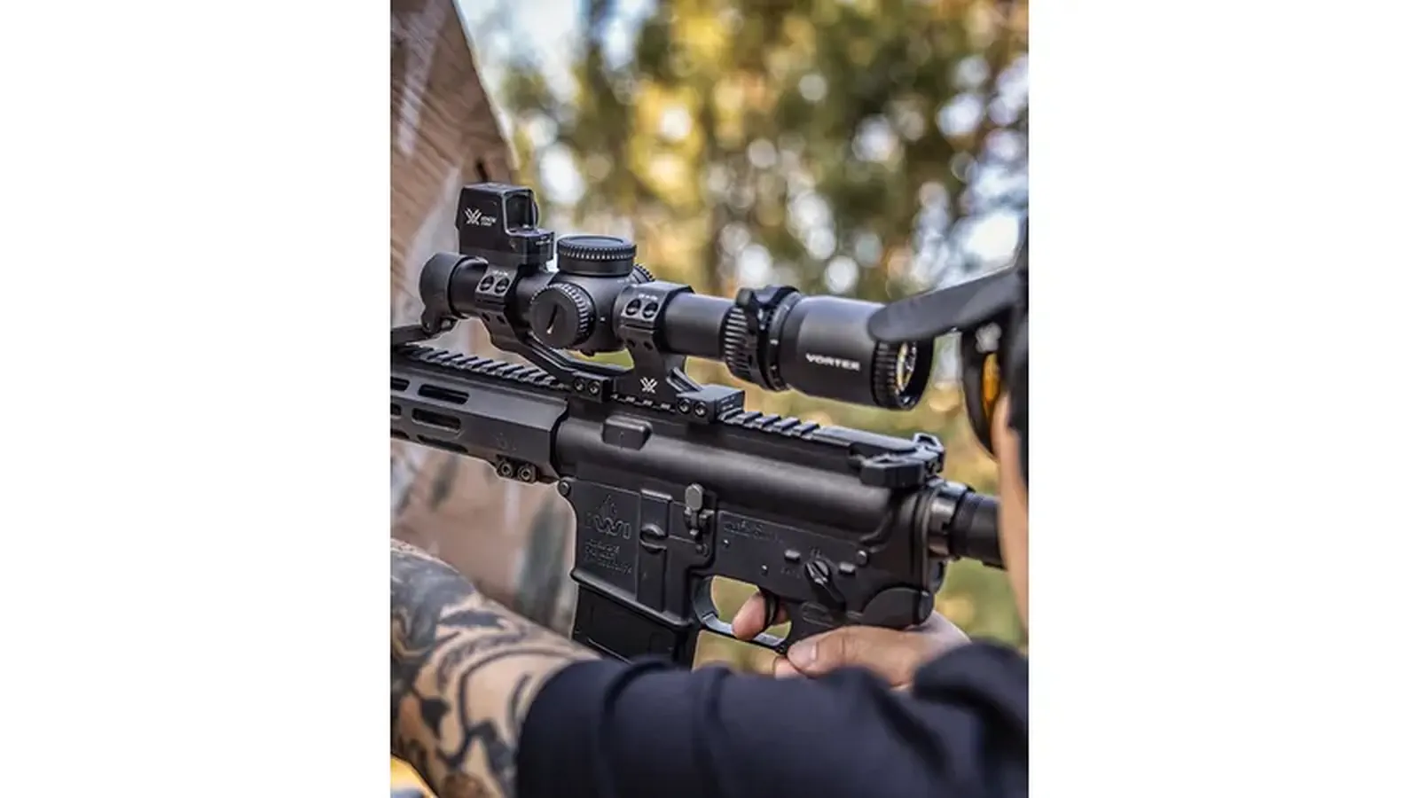 W dynamicznym strzelaniu ten zestaw pozwala Ci płynnie przełączać się między kolimatorem a lunetą bez zbędnych kompromisów. Przednia obejma lunety została zaprojektowana jako platforma montażowa dla kolimatora w standardzie Vortex Venom / DPP footprint, dlatego całość pozostaje zwarta i wygodna w obsłudze. Gdy pracujesz na krótkim dystansie, korzystasz z czerwonej kropki 3 MOA, a przy dalszych celach od razu przechodzisz na powiększenie lunety. To szczególnie praktyczne na strzelnicy sportowej i podczas intensywnych treningów, gdzie liczy się tempo reakcji oraz powtarzalność składu.
