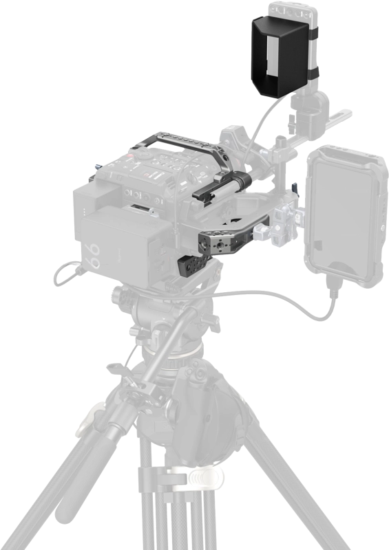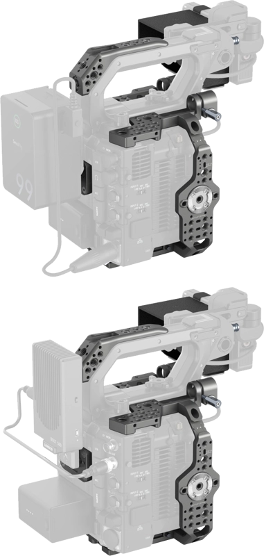 Płyta tylna z charakterystycznym „serowym” układem otworów pozwala wygodnie rozmieścić akcesoria z tyłu kamery, odciążając górę i boki. Zamontujesz na niej baterię V-mount (przez odpowiedni adapter), transmitery, odbiorniki audio albo małe skrzynki I/O – wszystko z dala od wizjera i pokręteł. Otworki 1/4”-20 i 3/8”-16 oraz punkty ARRI utrzymują osprzęt w stabilnej pozycji, a wyważenie zestawu na statywie lub ramię jest łatwiejsze. W efekcie przewody biegną krótszą i bezpieczniejszą trasą, co porządkuje set i ogranicza ryzyko przypadkowego wypięcia.