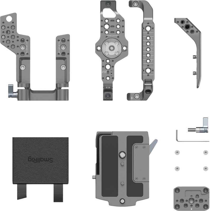 Konstrukcja zestawu opiera się na czterech głównych płytach – górnej, lewej, prawej i bazowej – które łączysz w zależności od scenariusza nagrań. Montuj pełną klatkę, gdy plan zakłada rozbudowaną konfigurację z monitorem, odbiornikiem audio i zasilaniem V-mount, albo korzystaj tylko z płyty bazowej i górnej, kiedy liczy się mobilność. Wymienne elementy działają jak klocki: konfigurowanie jest intuicyjne, a całość zachowuje sztywność, dzięki czemu nagrywasz stabilnie bez obawy o luzy. Co ważne, w każdej konfiguracji masz dostęp do złączy kamery i przycisków, więc obsługa pozostaje szybka i naturalna.