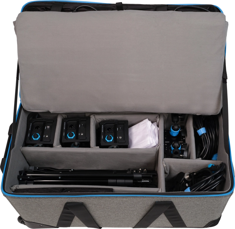 W pudełku znajdziesz trzy panele LED, statywy, softboxy i wytrzymałą walizkę na kółkach, która ułatwia transport całego kompletu. Dzięki temu twórca otrzymuje gotowy do pracy zestaw oświetleniowy, który sprawdzi się zarówno w profesjonalnym studiu, jak i w pracy w terenie.
