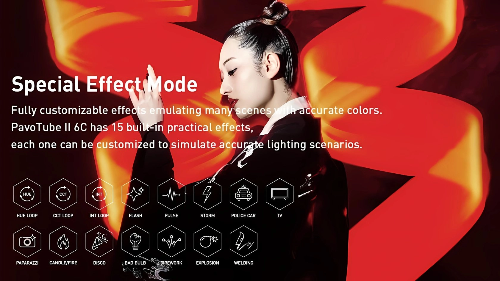 PavoTube II 6C oferuje aż 15 wbudowanych efektów specjalnych, takich jak błyskawice, ogień, fajerwerki, sygnał SOS, tryb telewizora czy światło policyjne. Użytkownik może w prosty sposób zmieniać ustawienia i dopasować scenę do potrzeb produkcji. To świetne narzędzie nie tylko do klasycznego oświetlenia, ale także do tworzenia dynamicznych i nietypowych efektów wizualnych.